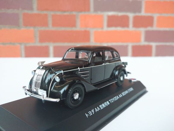 1936年トヨタ自動車初の生産型乗用車として誕生したAA型乗用車。 専用のパッケージに発売当時のカタログ(ミニカタログ)入り。 エンジンは、シボレーに倣った排気量3389ccの水冷直列6気筒OHVで、65HP/3000rpmを発揮。1936年7月名古屋で、9月に東京で発表した。発売当初の価格は3,350円(名古屋店頭渡し)で、1942年までに1,404台が生産された。翌1937年にはトヨタ自動車工業株式会社を設立し、本格的な自動車生産の第1歩を踏み出した